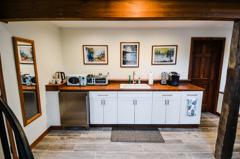 The cottage originally served as the farm's carriage house in the 1800s. It was converted into a caretaker's residence in the '70s when the farmhouse transitioned to a summer/holiday getaway. We have fully renovated this private living space with bridal parties and newlyweds in mind! The main floor consists of a kitchenette, a lounge area with an electric fireplace, and a powder room with a large makeup counter. Up the original spiral staircase lies a luxurious honeymoon suite. Included in the rental fee for larger events using the barn, the cottage is also available throughout the year for vacation rental (in conjunction with the farmhouse). With a queen sofa bed downstairs it can hold up to four overnight guests, making it an ideal space for couples or small groups.